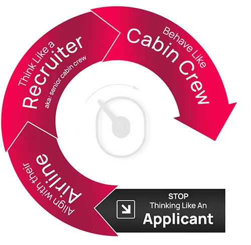 Red directional indicators do more than reference aircraft emergency exits; they represent the multi-directional nature of our training philosophy. Just as there are many exits on an aircraft, there are many valid paths for aspiring crew. No single approach, style, or candidate journey is the same. The arrows remind us that interview preparation is not one-size-fits-all. Each applicant brings unique strengths, cultural perspectives, and career goals, and our training adapts accordingly.