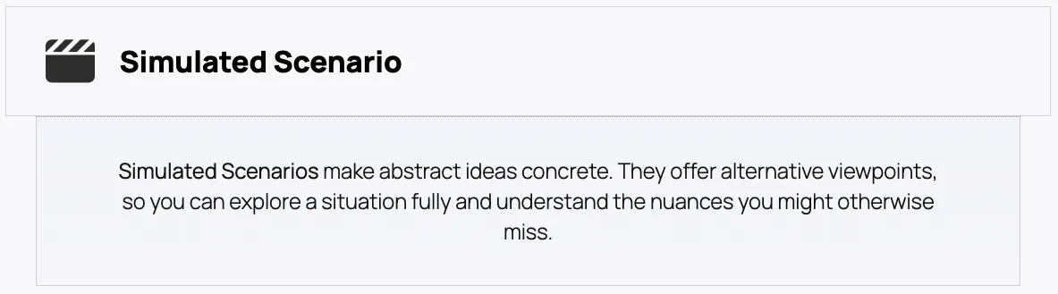 Simulated scenarios employ extended metaphors and hypotheticals to translate complex concepts, technical language, and regulations into familiar, everyday contexts, making abstract ideas concrete, understandable, and memorable.