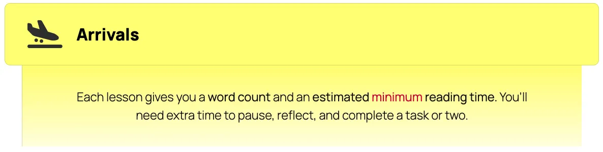 At the beginning of each lesson, a bright yellow arrivals marker communicates key metadata — update date, author, word count, and estimated reading time. This supports learner planning, promotes transparency, and builds trust in the material.