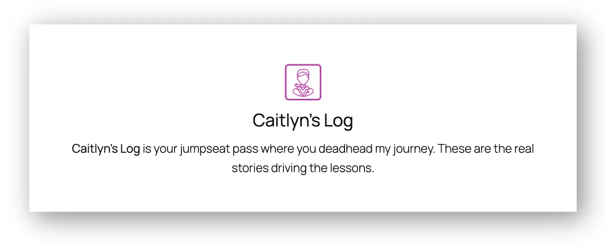 Caitlyn’s Log is a story-driven case study embedded within the lessons. It provides learners with a real-world example of an interview scenario, based on my own journey. Positioned as a “deadheading” or supernumerary perspective, it allows learners to observe authentic behaviours and decision-making in context.