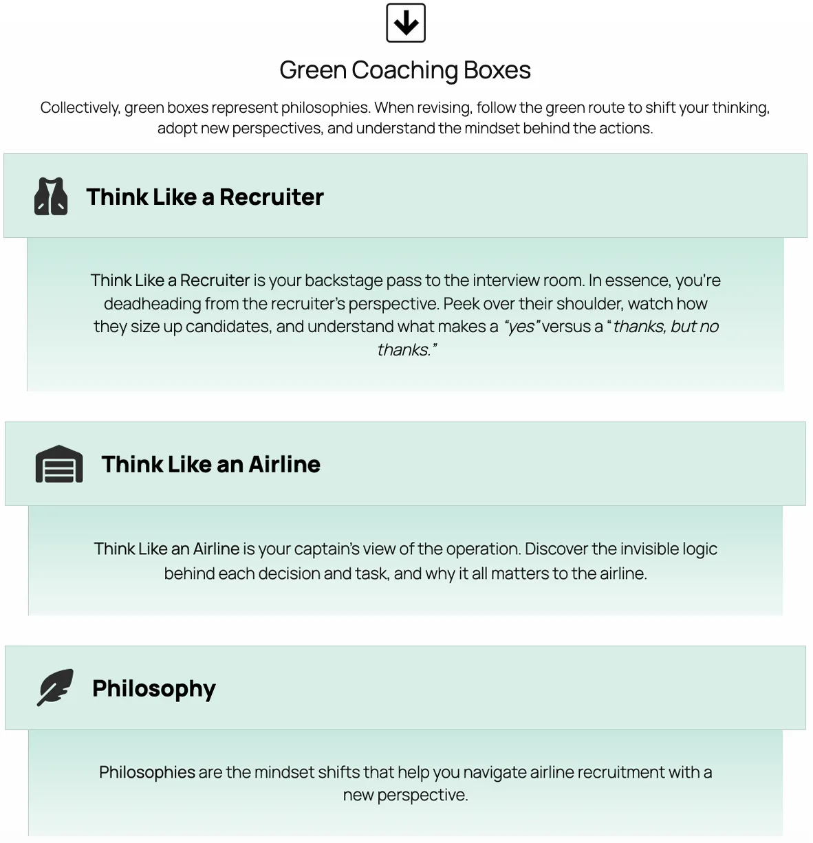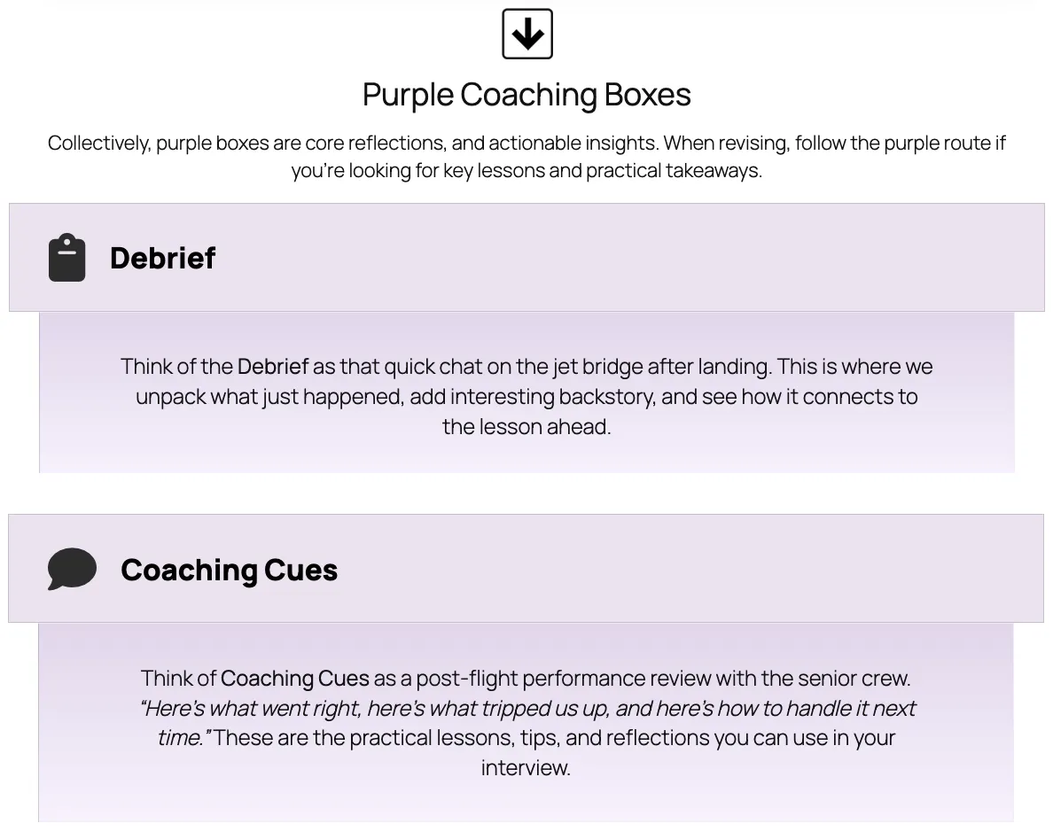 Coaching cues play with aviation language, helping learners connect with the career, become familiar with key terminology, and reframe interviews as an engaging, career-focused experience.