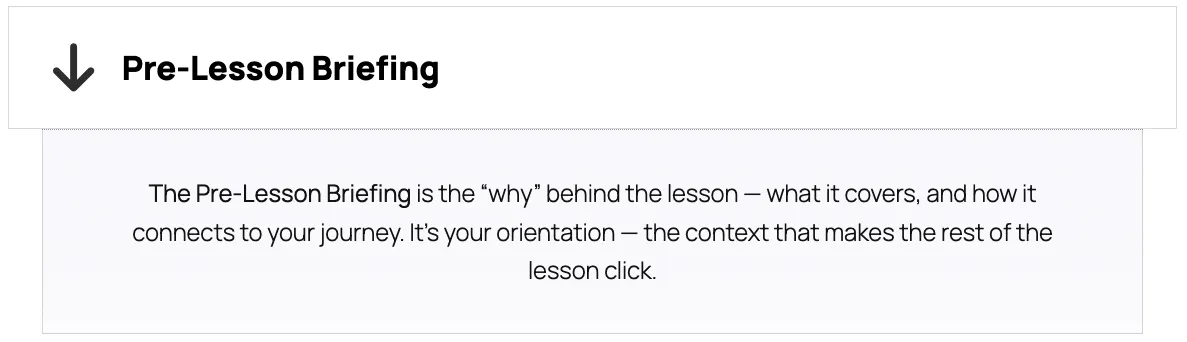 Pre-Lesson Briefings, modelled on a cabin crew pre-flight briefing, set expectations, outline objectives, and establish relevance. They ensure learners are both cognitively and emotionally prepared for the lesson ahead.