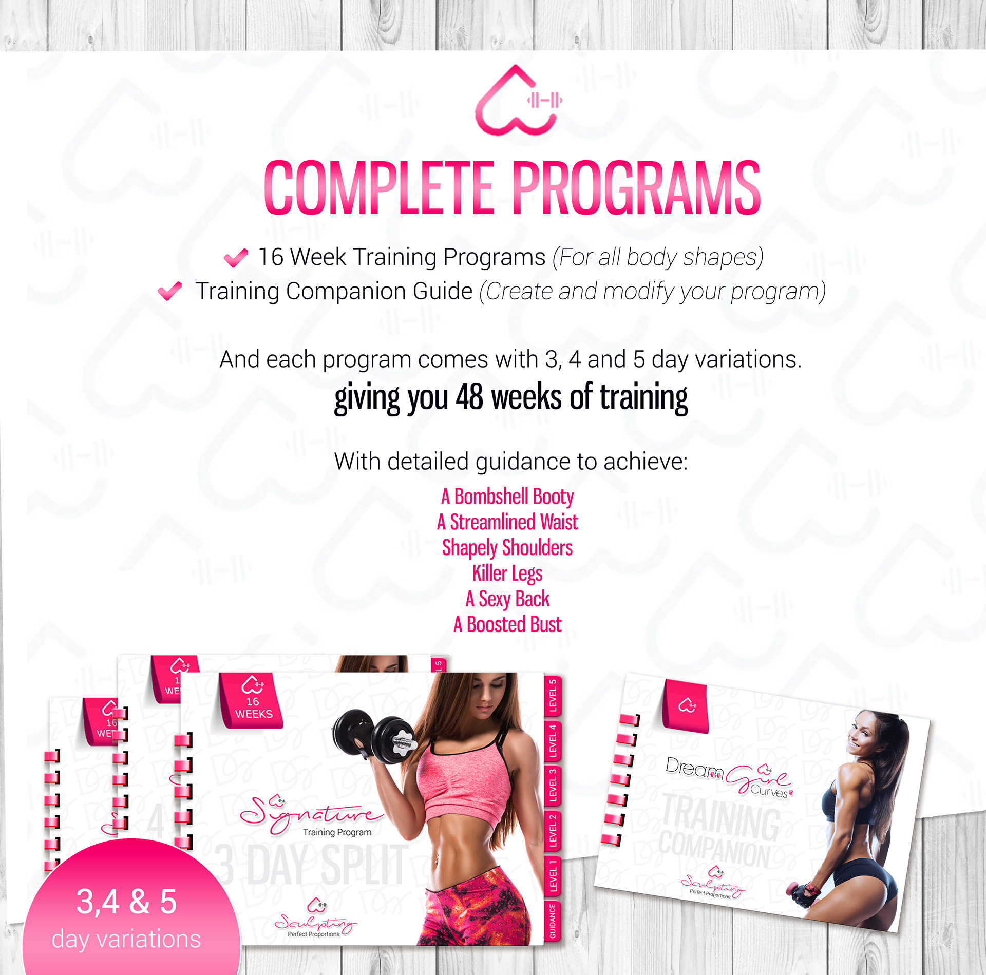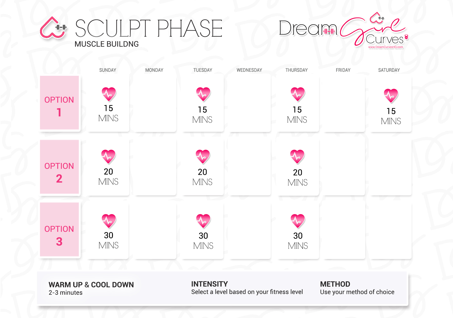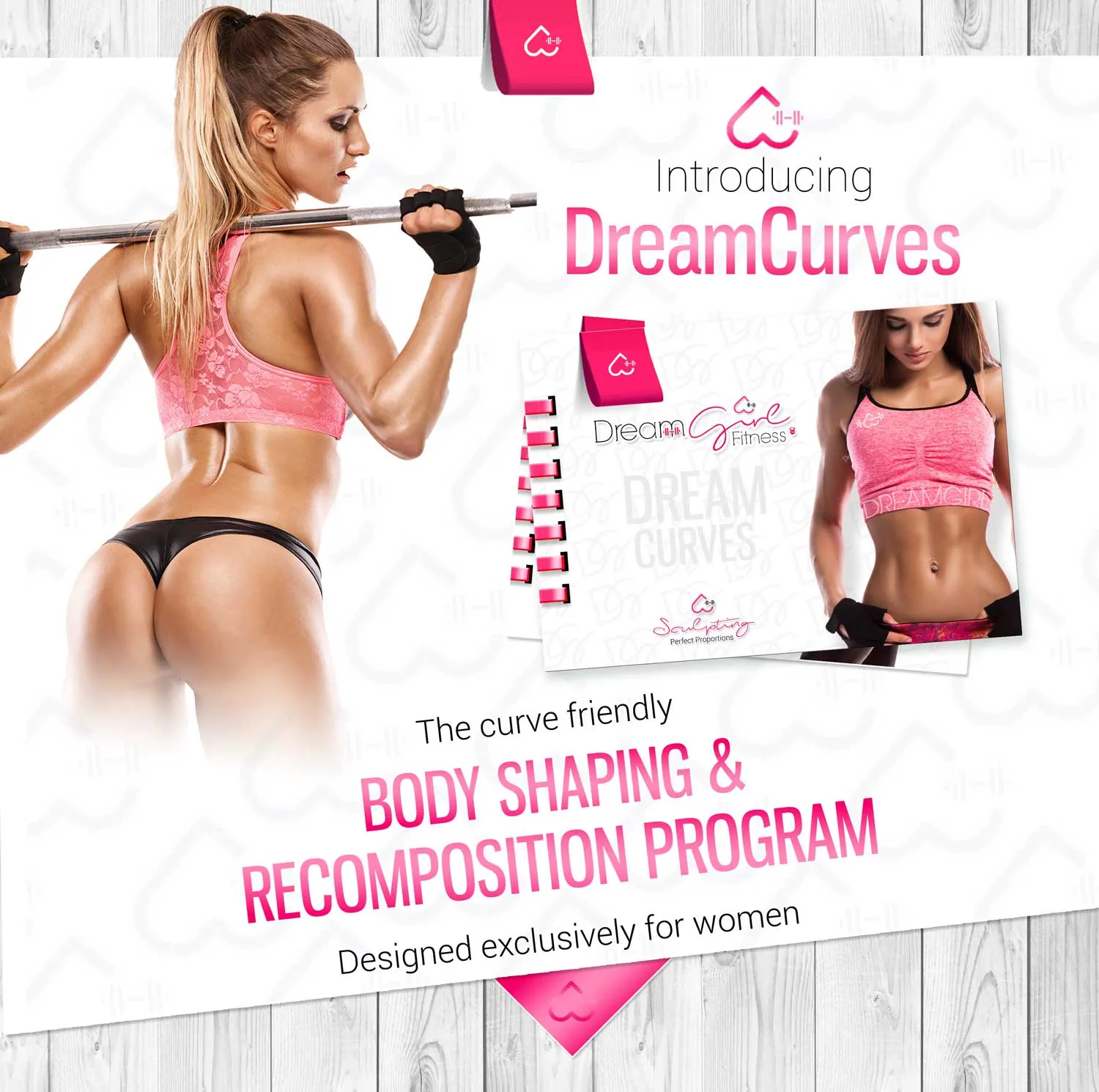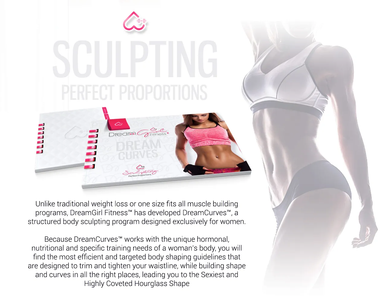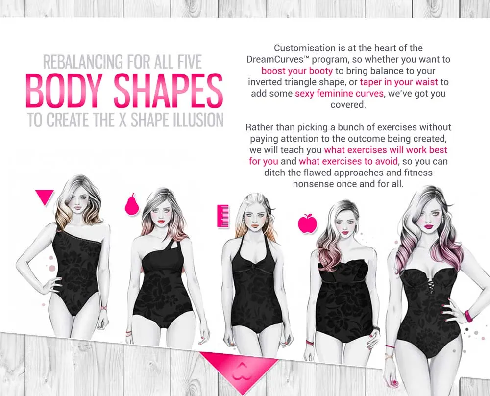 The DreamCurves logo features an upside-down heart as its centrepiece, symbolising the female form — accentuating the curves of the hips and a tapered waist. Integrated into the design is a small dumbbell, representing the strength and empowerment that come from weight training — a core component of the programme.